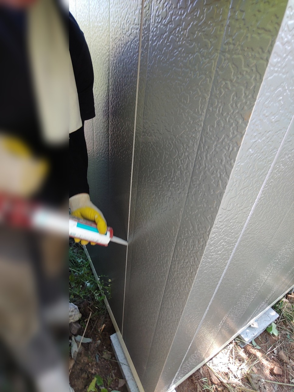 만들어진 저온창고에 한치의 냉기 누설이 발생하지 않게 실리콘과 스크류볼트로 마무리작업을 합니다.